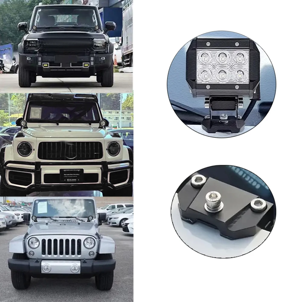 Engineered from durable aluminum alloy with a protective anti-corrosion coating, this universal hood light bracket delivers professional-grade mounting for LED work lights, fog lights, and light bars across trucks, jeeps, pickups, and SUVs. The integrated rubber pad design prevents slipping while safeguarding your vehicle's finish from scratches. Installation requires no drilling—simply secure with provided screws for a rock-solid hold. Adjustable positioning ensures optimal lighting angles for maximum visibility during off-road operations. Compatible with most standard LED lighting systems, this bracket combines reliability with versatile functionality for serious 4x4 enthusiasts.